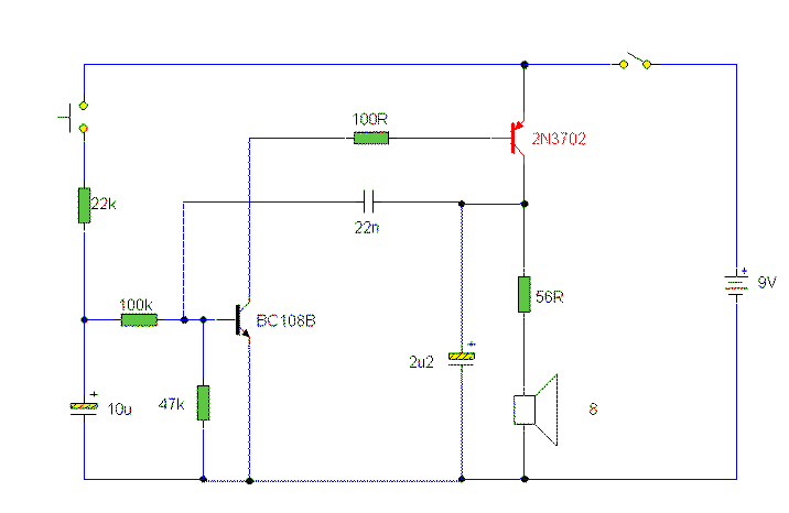 The sound produced imitates the rise and fall of an American police siren. When first switched on the 10u capacitors is discharged and both transistors are off. When the push button switch is pressed to 10u capacitor will charge via the 22k resistor. This voltage is applied to the base of the BC108B which will turn on slowly. When the switch is released the capacitor will discharge via the 100k and 47k base resistors and the transistor will slowly turn off. The change in voltage alters the frequency of the siren. The oscillator action is more difficult to work out. As the BC108B transistor switches on its collector voltage falls and so the 2N3702 transistor is switched on. This happens very quickly ( less than 1us). The 22n capacitor will charge very quickly as well. As this capacitor is connected between the collector of the 2N3702 and the base of the BC108B, it soon reaches almost full supply voltage. The charging current for the capacitor is then much reduced and the collector emitter voltage of the 2N3072 is therefore increased; the collector potential will fall. This change in voltage is passed through the 22n capacitor to the base of the BC108B causing it to come out of saturation slightly. As this happens its collector voltage will rise and turn off the 2N3072 transistor more. This continues until both transistors are off. The 22n capacitor will then discharge via the 100k, 22k resistor, the closed push button switch, 9V battery, the speaker and 56 ohm resistor. The discharge time takes around 5-6msec. As soon as the 22n capacitor is discharged, the BC108B transistor will switch on again and the cycle repeats. The difference in voltage at the collector of the BC108B (caused by the charging 10u capacitor) causes the tone of the siren to change. As the 10u capacitor is charged, the tone of the siren will rise, and as it is discharged, it will fall. A 64 ohm loudspeaker may be used in place of the 8 ohm and 56 resistor, and the values of components may be altered to produce different sound effects.